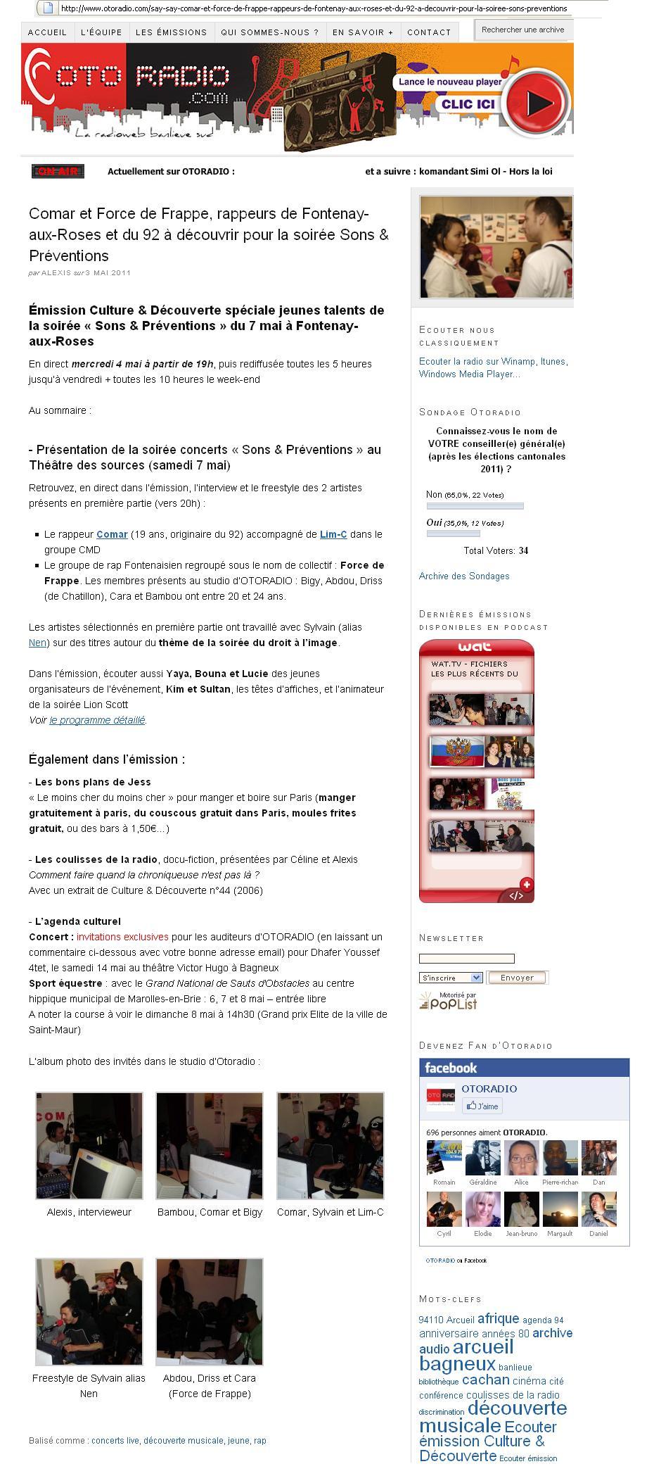 CĂŽtĂ© audience, lâĂ©mission Come-Back de Laurent Vidal, avec le groupe Les Poppys en invitĂ©s, est lâĂ©mission la plus commentĂ©e et la plus consultĂ©e du site. Elle devance notamment lâĂ©mission Expression Libre consacrĂ©e au quartier Jean MacĂ© Ă Arcueil, qui fut Ă©galement la derniĂšre Ă©mission de Lionel Chevalier sur Otoradio.