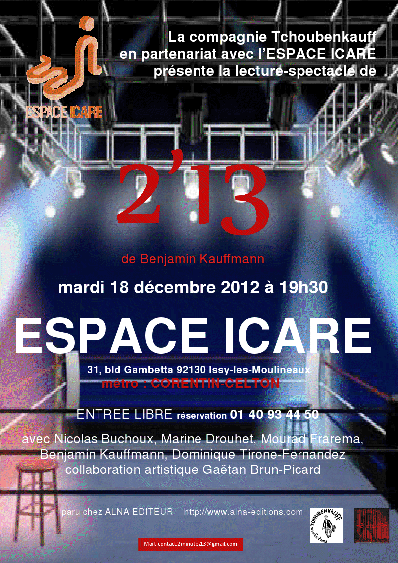 De la boxe au théâtre il n’y a qu’un pas. C’est le challenge que s’est fixé l’association 2minutes13. Mardi 18 décembre à 19h30 à l’espace Icare d’Issy-les-Moulineaux, elle vous propose une lecture spectacle du projet 2minutes13 de Benjamin Kauffman.