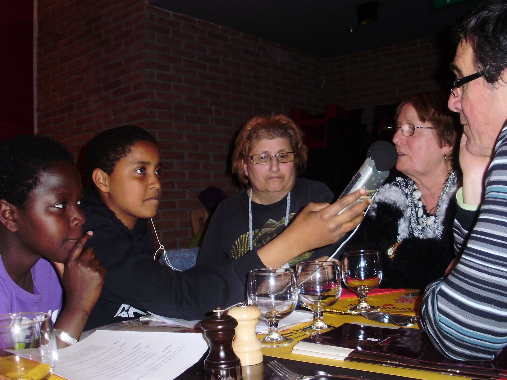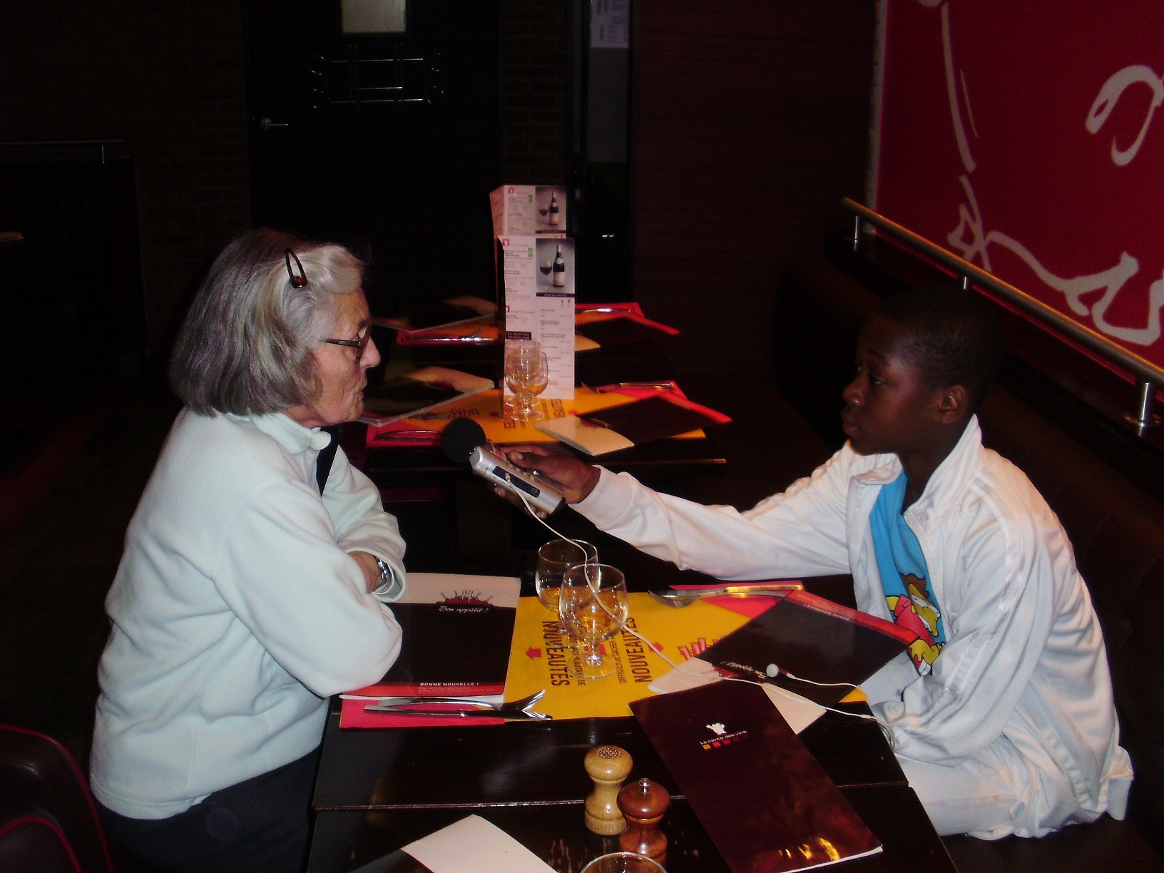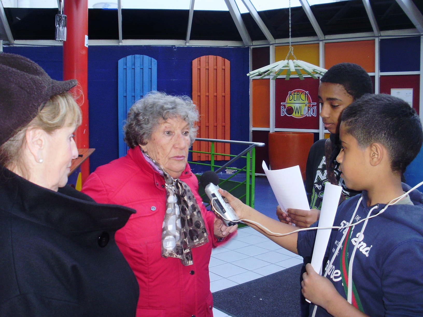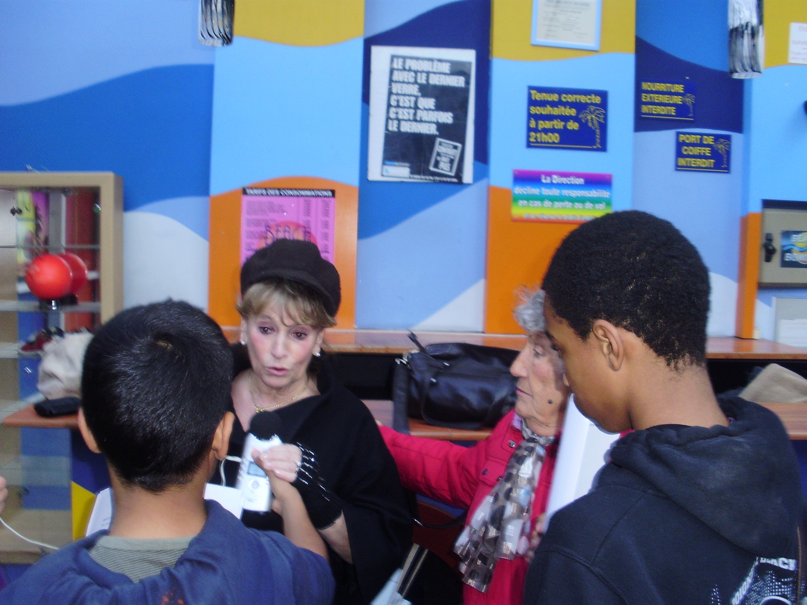 Nous vous proposons d’écouter notre premier reportage réalisé au bowling de Thiais avec Raymonde et Mado, tout d’abord, puis sur le chemin du retour avec Marie-Claire et Marie-Thérèse dans le car, et enfin avec Daniel, Nelly, Paulette et Solange, le soir au restaurant de la Vache Noire. Nous tendons notre enregistreur à toutes ces personnes qui ont l’âge de nos grands parents, et nous leur posons les questions que nous avons préparées. Par exemple nous voulons savoir s’ils ont de bonnes relations avec les jeunes ou comment ils vivaient sans les appareils technologiques d’aujourd’hui ou encore s’ils aimaient aller à l’école. Et à notre tour nous répondons à leurs questions : comment nous voyons dans dix ans ? Quels sont nos rêves ?.. vous écouterez les réponses dans ce premier reportage…