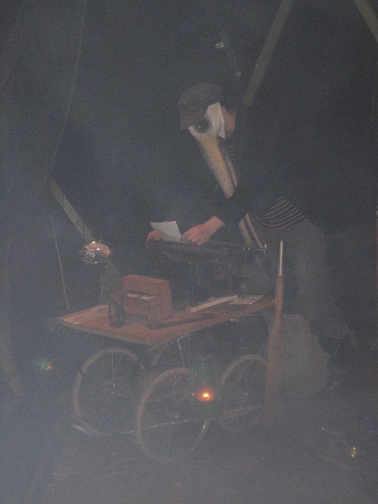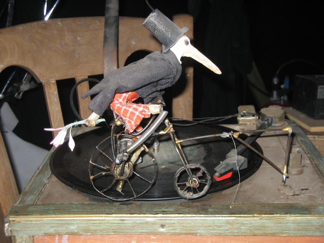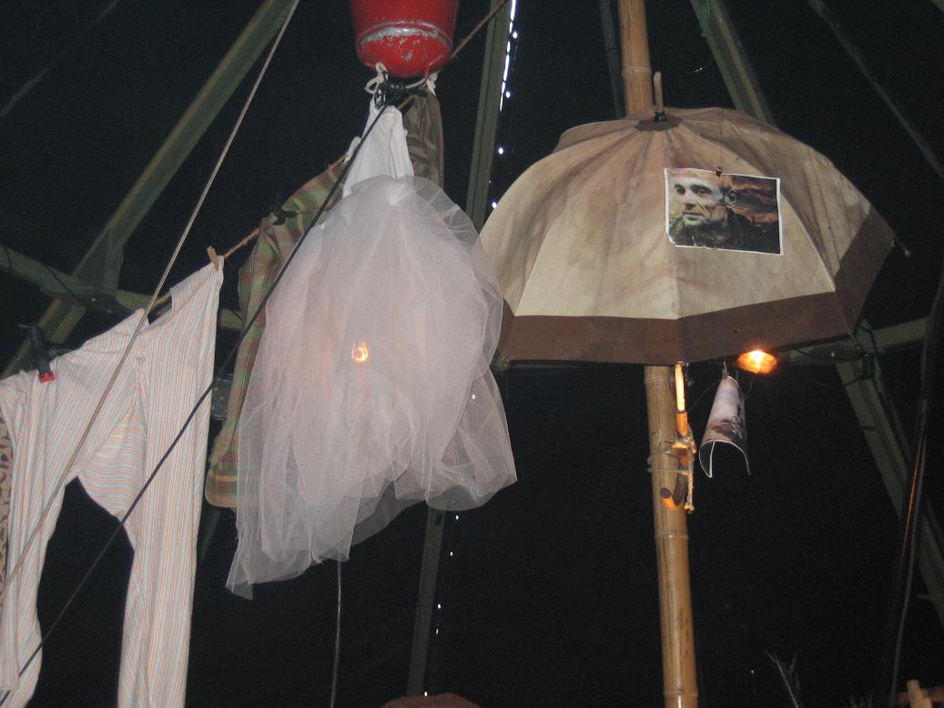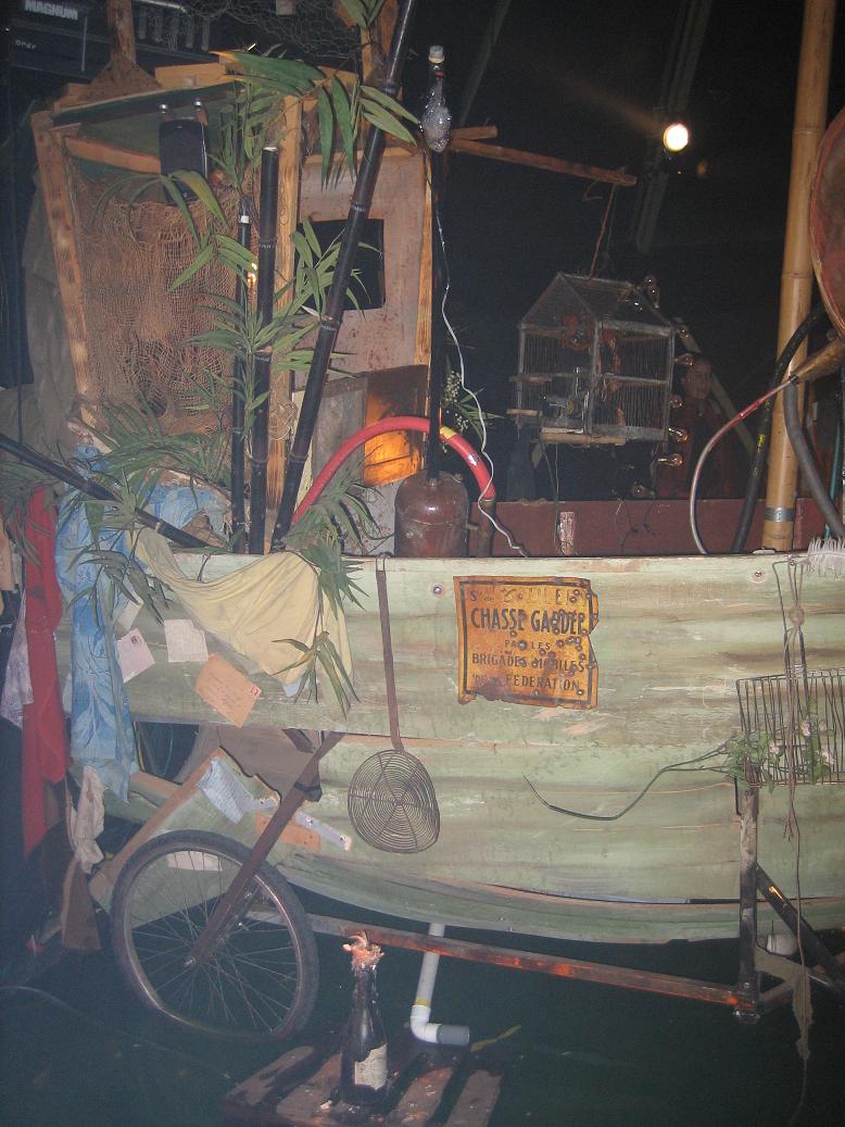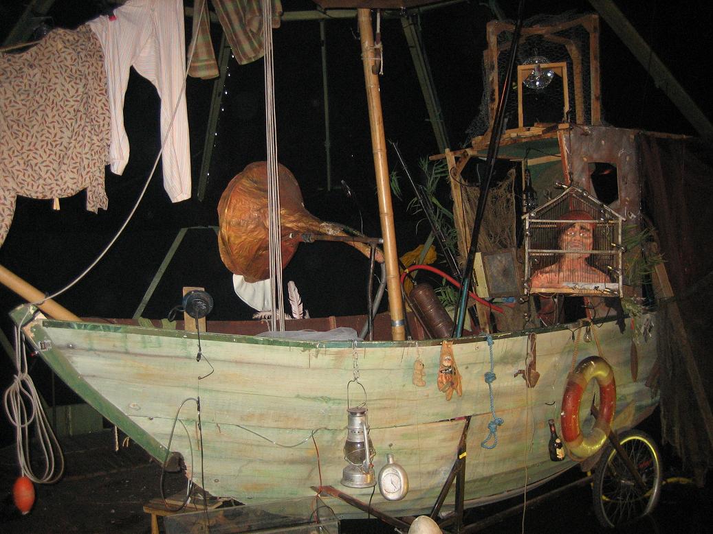 A l’intérieur, un étrange bateau à roulettes entouré d’objets incongrus. Au rythme de la musique et des jeux de lumière, ces bibelots prennent vie et plongent le spectateur dans un univers décalé peuplé des souvenirs et des songes de Madame Poussin. Au fil de ce périple, rencontre avec des personnages plus troublants les uns que les autres : le marin (Yann), l’homme oiseau (Nicolas Vuiller) ou encore la poupée automate (Flore)…