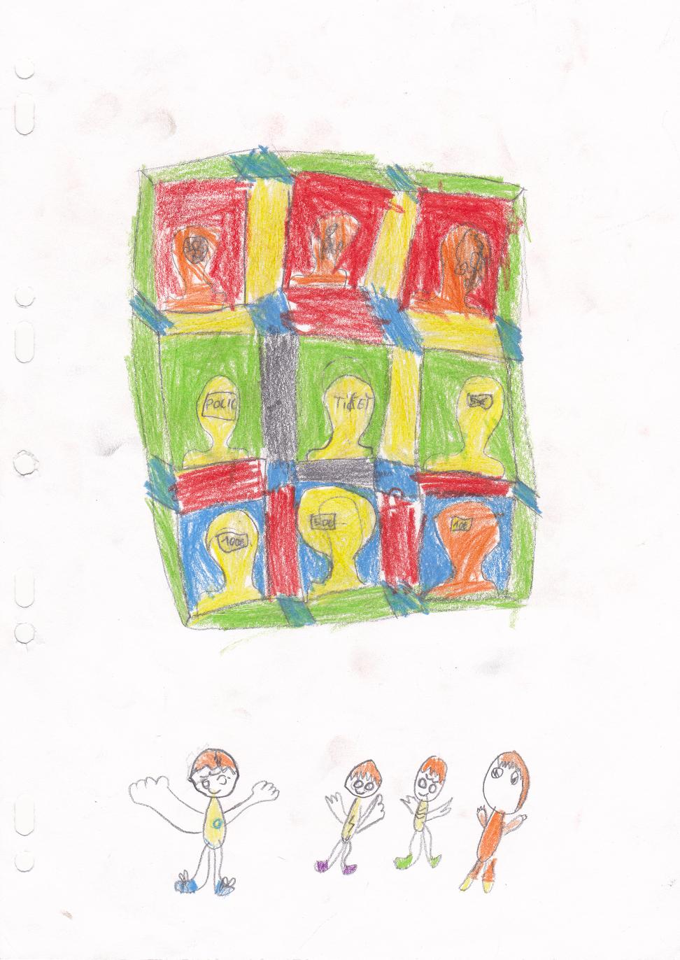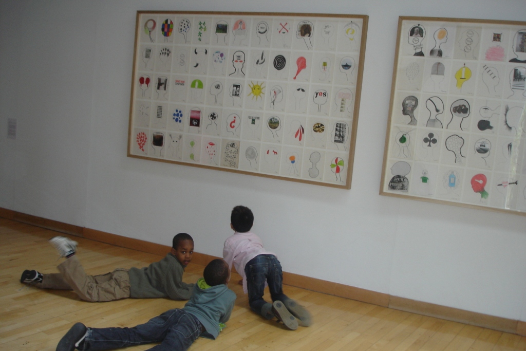 A l’étage, c’était rigolo de voir plein de têtes remplies avec des dessins, des CDs, des collages, … Encore une fois, cela nous a donné envie de faire pareil en classe et c’est ce que nous avons fait : nous avons tous dessiné des têtes avec nos pensées, nos cauchemars ou nos rêves. C’était intéressant d’écouter les idées des autres.