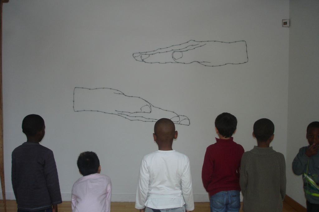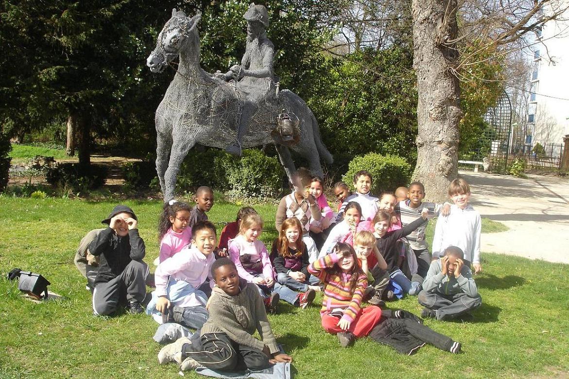 A la fin de la visite, comme il faisait beau, nous avons couru dans le jardin de la Maison des Arts et nous avons découvert comme des statues : des girafes et un cheval avec un cavalier. Nous avons bien aimé car c’était fait d’une autre façon, avec du fil de fer. C’était rigolo de jouer à chat autour des girafes !»