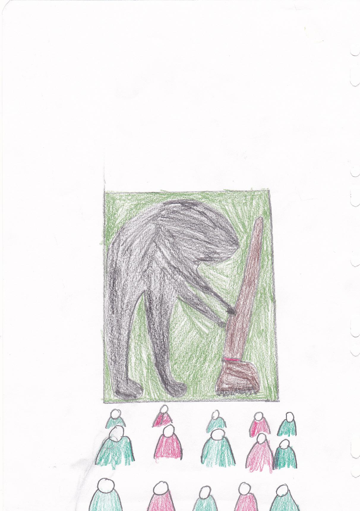 Un peu plus loin, nous avons découvert un balayeur tout noir qui fumait. Il avait un vrai balai. Le balayeur était tellement noir qu’on aurait dit son ombre. C’était bien d’essayer de deviner ce qu’il faisait, pourquoi il était courbé. Il avait l’air triste.